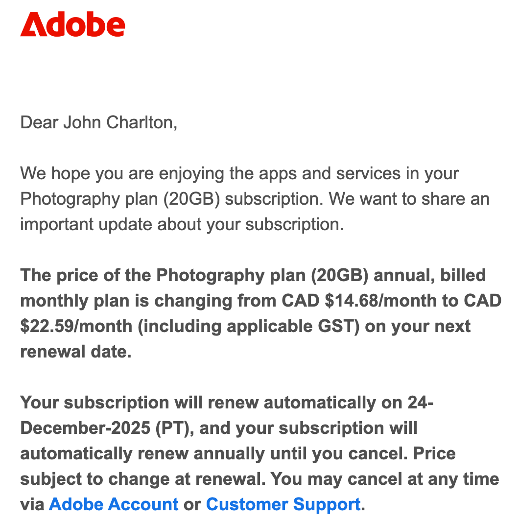 But it goes beyond the price hike. I kind of have a hate on for Adobe. I hate they charge people so much. They take unfair advantage of their market position to bleed people dry. They trick and trap people and make it difficult to get out of contracts. They gloss over the details and hide things in the small print.