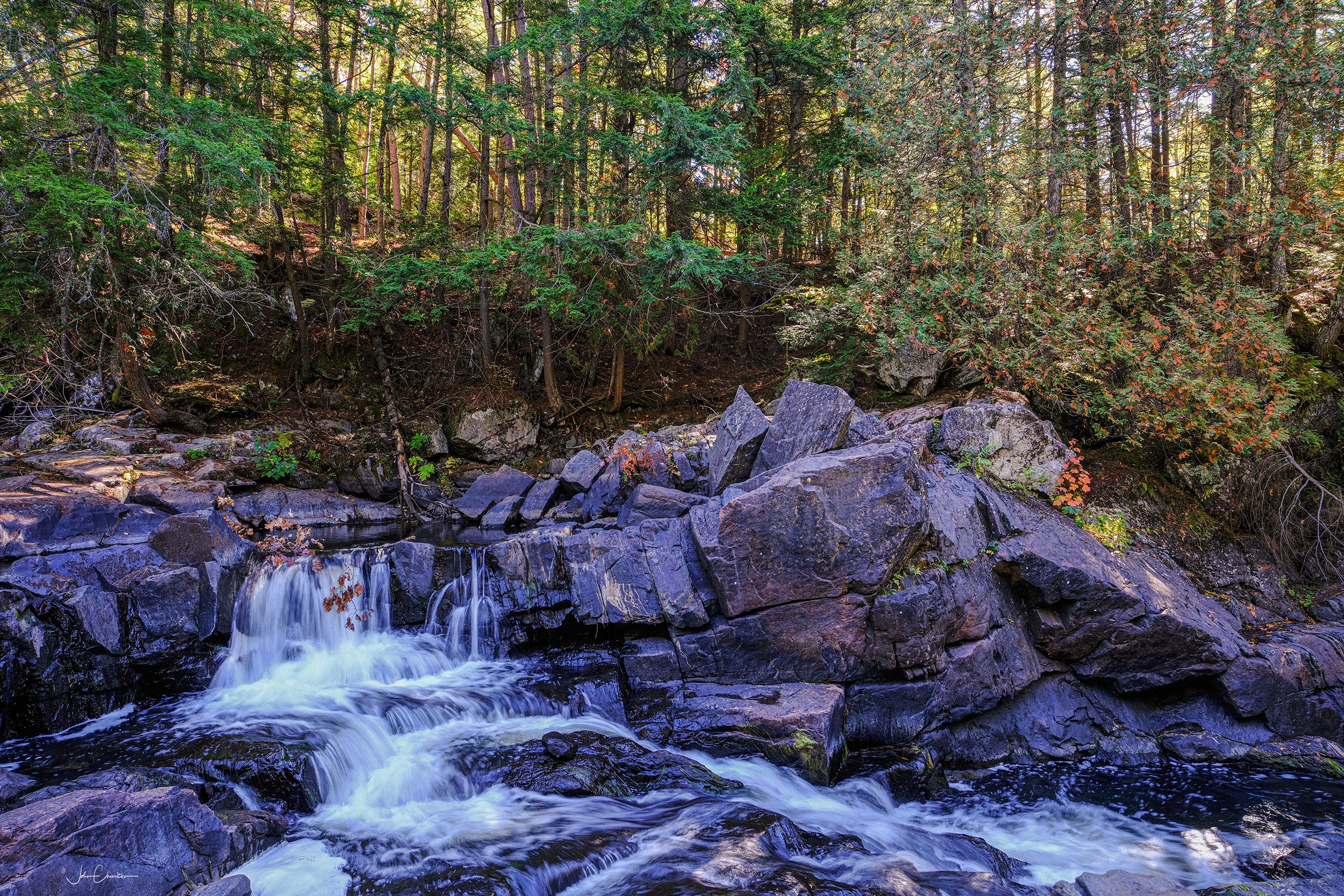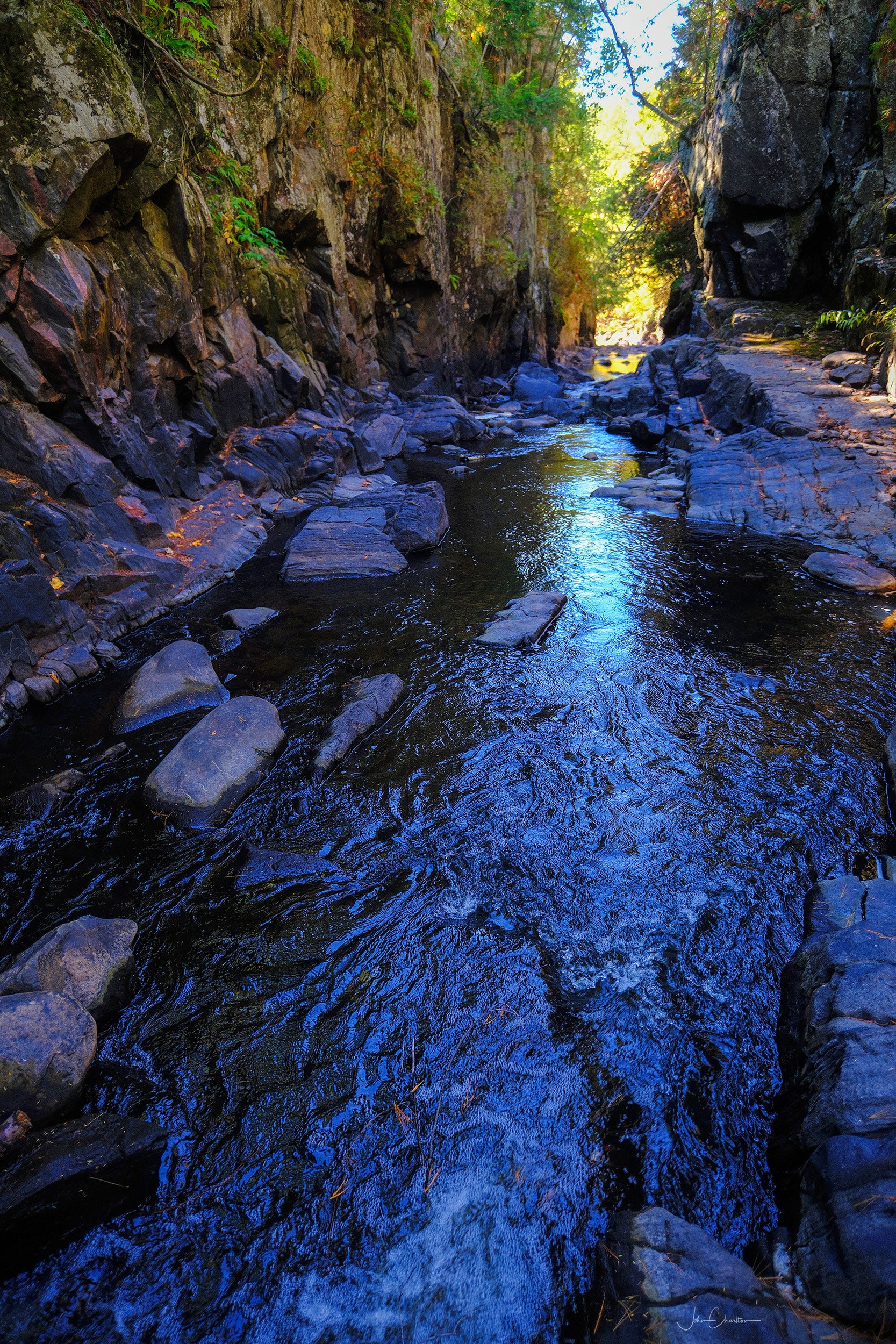 The Gut Conservation Area is a 400 acre site east of Apsley, Ontario managed by The Crow River Conservation Authority. The shot above shows the main portion of the 230 metre “gut” carved by the Crow River. In the Fall, the water level runs very low, allowing me to step down into the belly of the beast, but it is easy to imagine the torrent that must pass through here during the spring runoff. The walls of the small canyon rise about 30 meters and there is a viewing platform up top to watch the raging river from a safe distance. The stones were cold to the touch even as the heat of the day was building.
