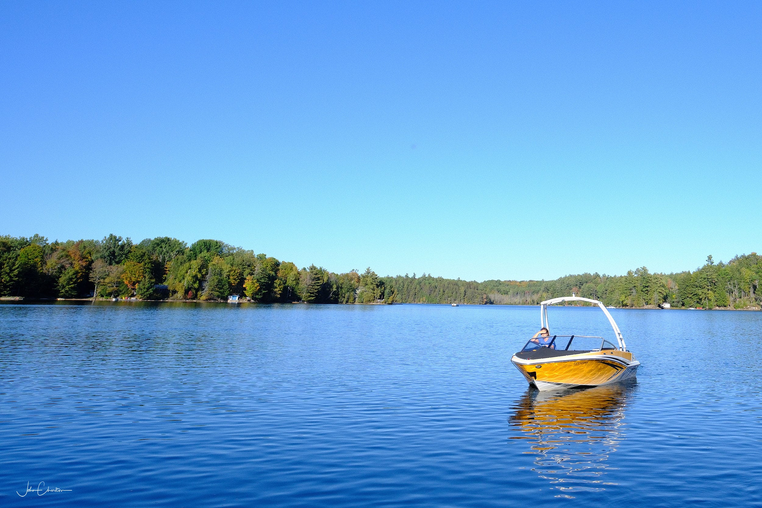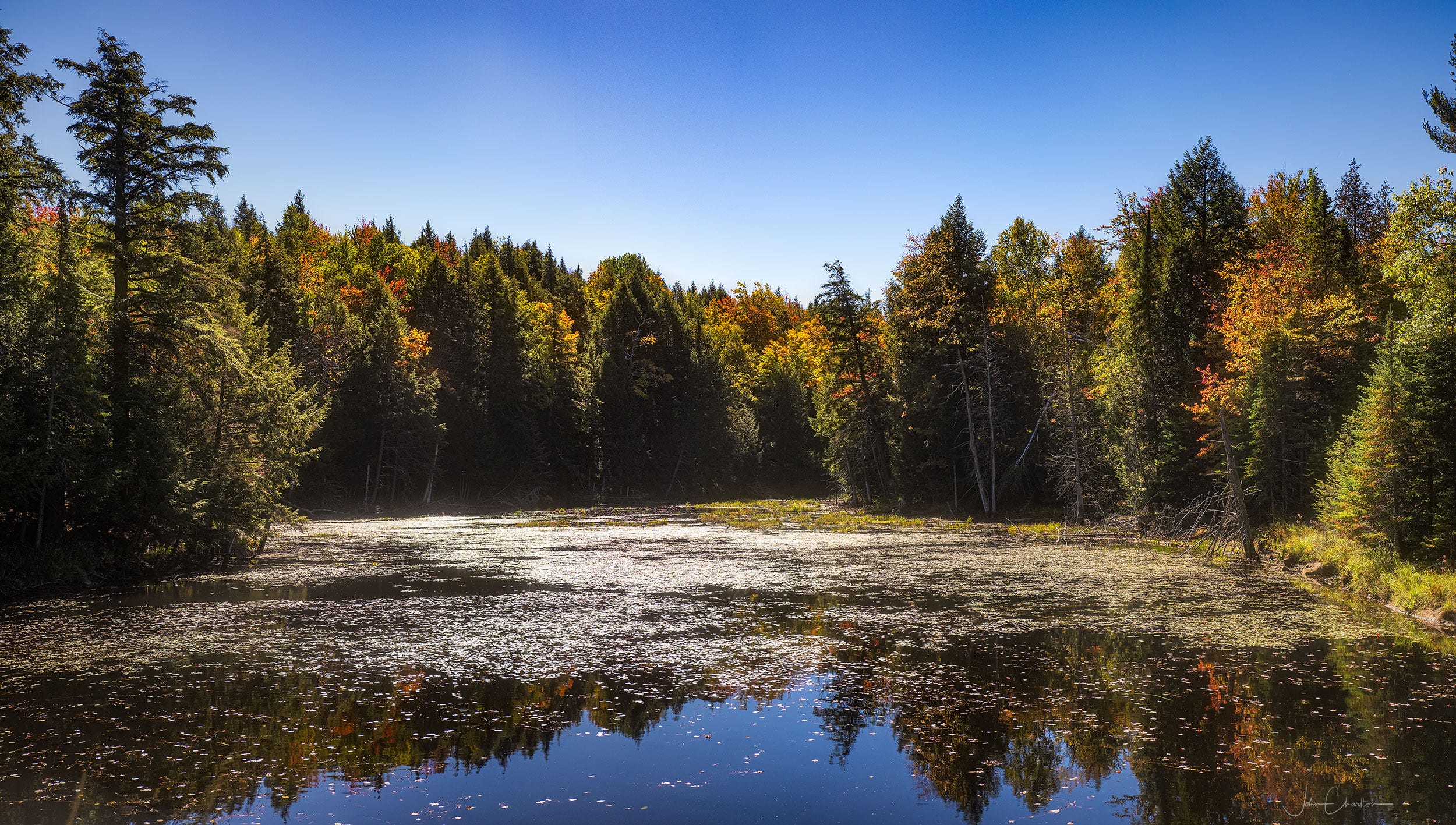 Finding a safe place to pull over, we got out to take the first pictures of the day. The colours were a little further ahead here and combined with the full sun and blue sky reflected in the water, it was a wonderful stop. There are plenty of lakes in the area, but most are out of sight from the roads. This was the first small body of water we were able to see close up. It was marked as private property along the road, but we respected the signs and stayed by the roadway.