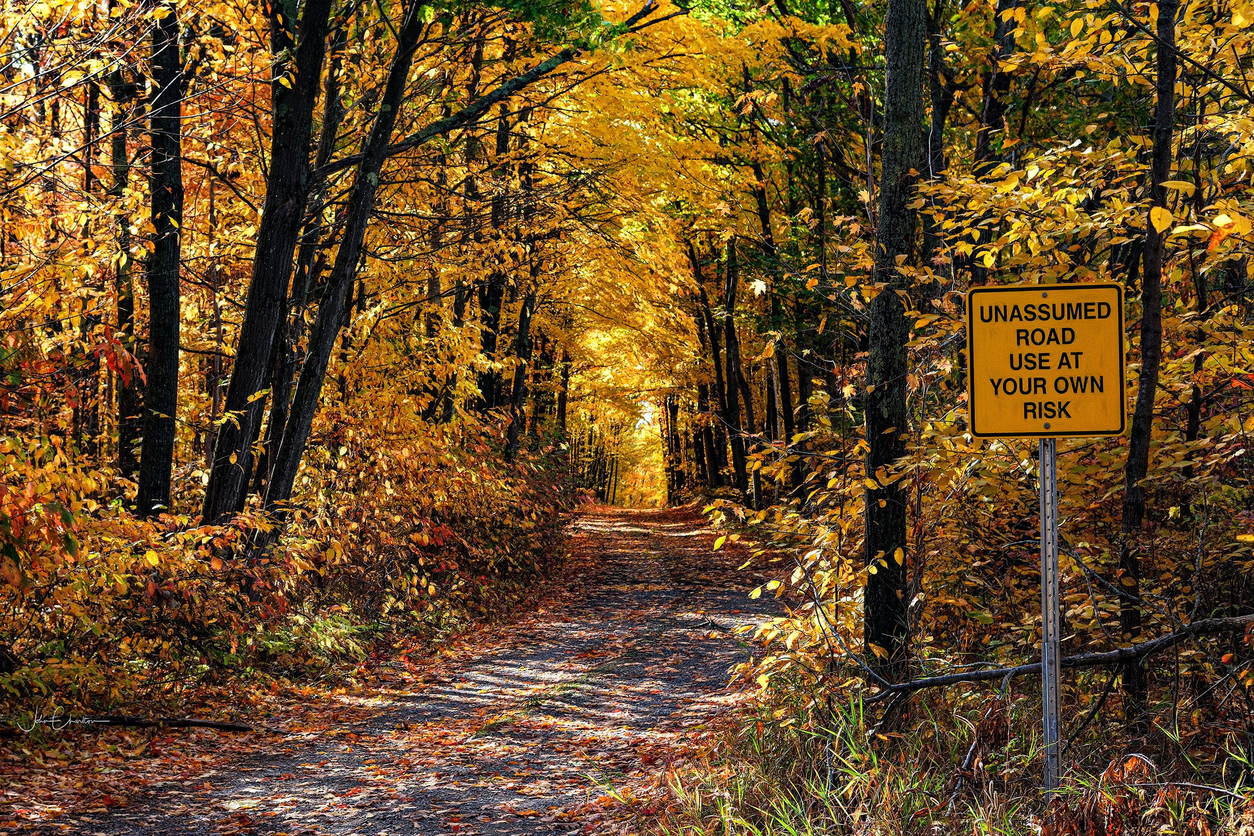 A few days later, I found myself wandering on my own down an old road near my home that I visit on occasion, always on foot as I am aware the road becomes near impassable by car soon after dipping down out of sight of the main road. It is perhaps my favourite autumn walk and being close to where I pick up my mail at a group box, it silently beckons me this time of year, especially given the taunting nature of the sign at its entrance.