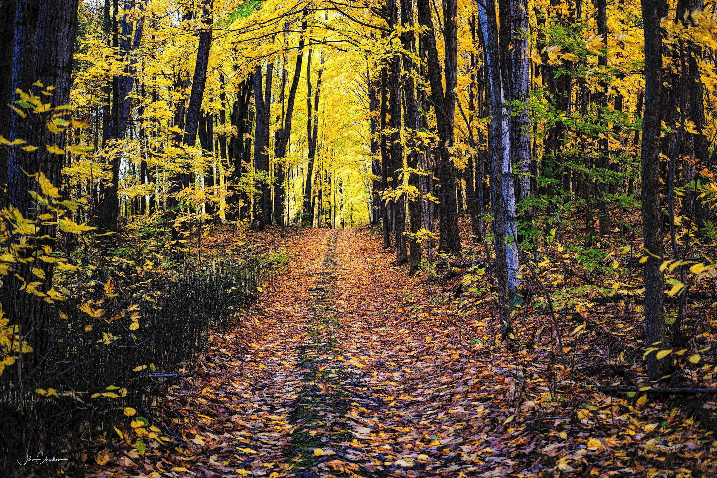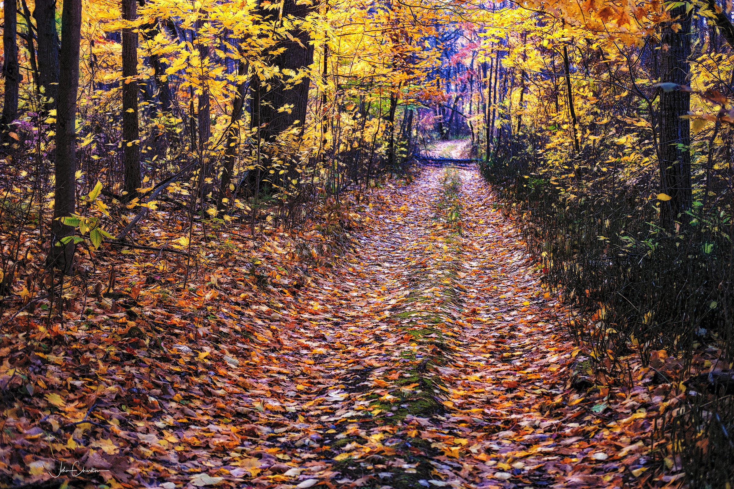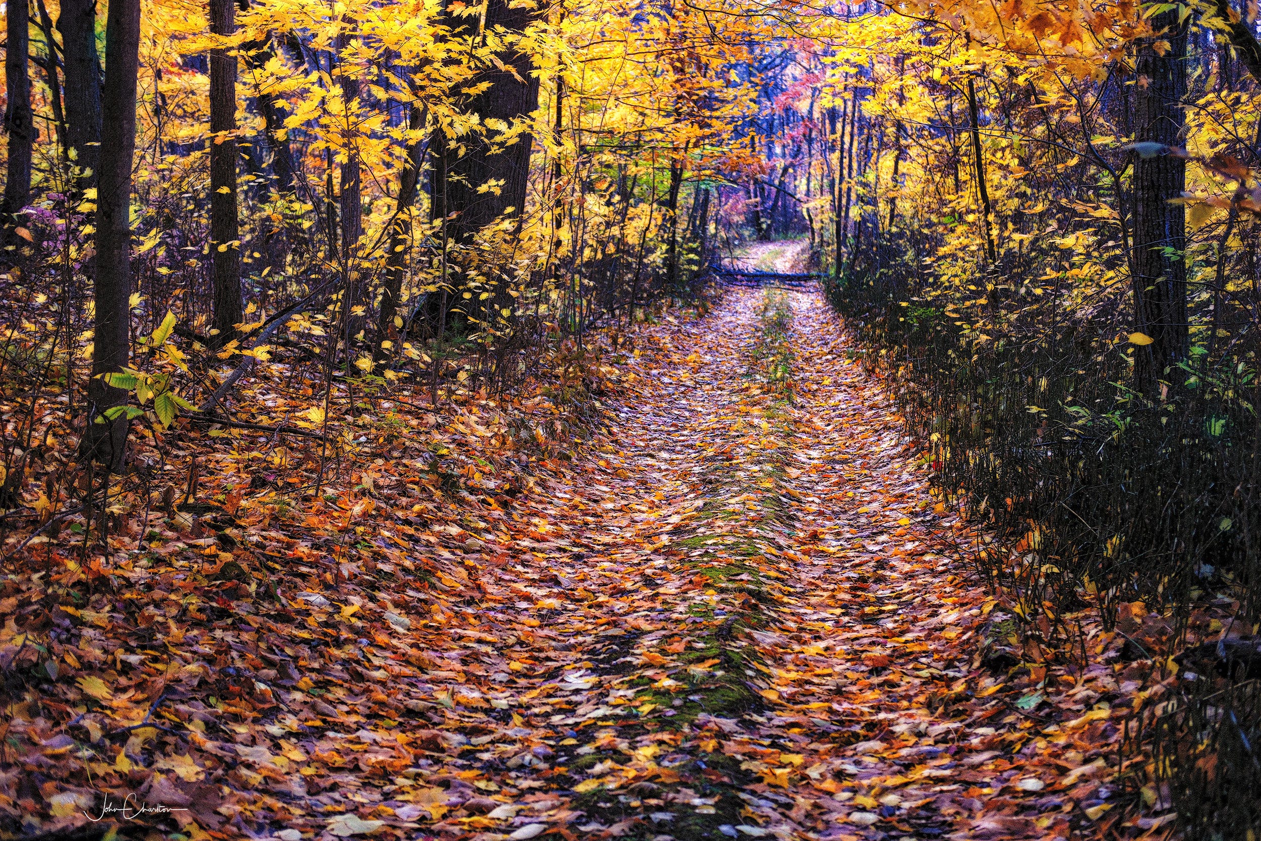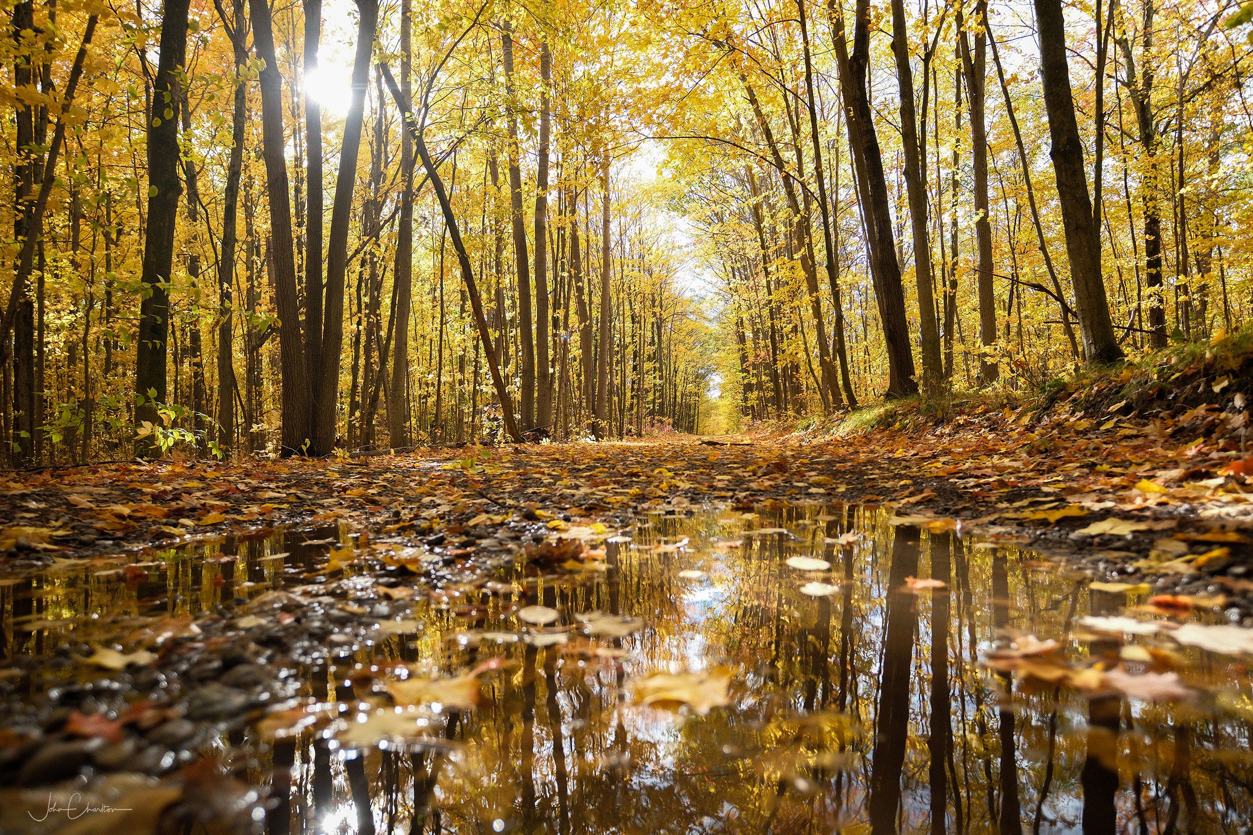 It had rained overnight, but the warm day had called for running shoes, not boots. The rain was welcome, one of the first breaks from a long season of none. The rain and accompanying wind had taking a toll on the vibrant red maple leaves which are always the first to fall. I found myself jumping the puddles where I could or stepping around them along the sides of the old road like the one above.