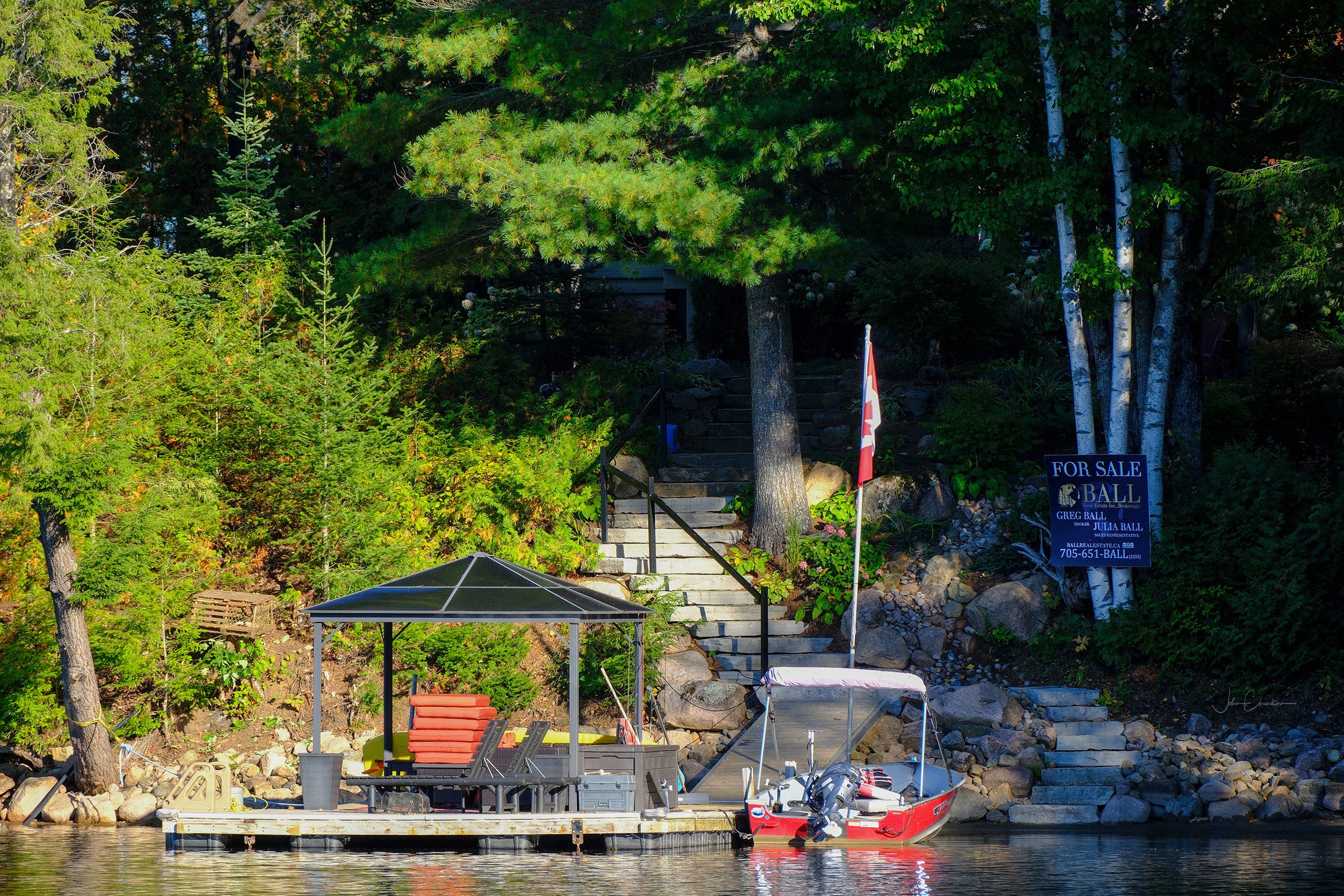 Originally called Mongosogan by the Mississauga Anishinaabe, on whose traditional territory it is situated, about 1200 cottages now line the lake, the one below, for sale.